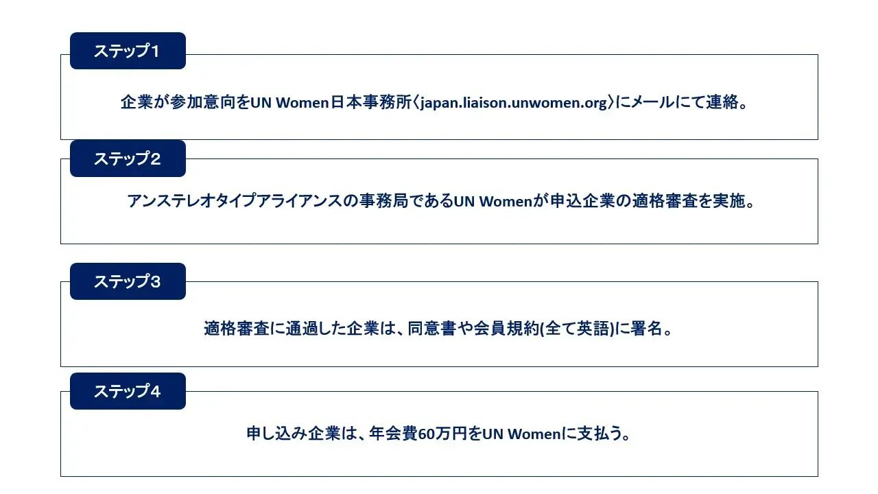 ② アンステレオタイプアライアンスの事務局であるUN Womanが、申し込み企業の適正審査を実施する。