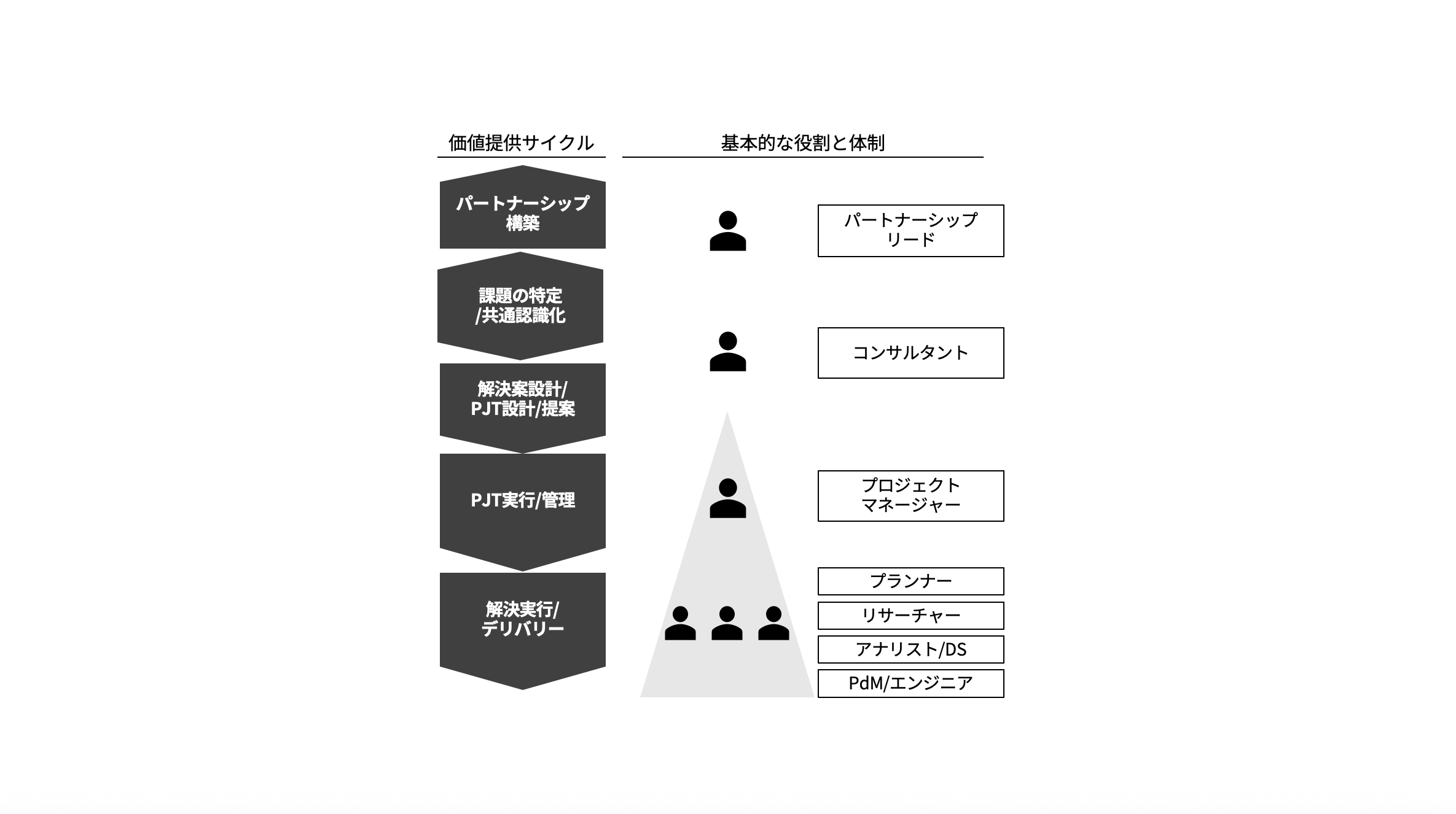 その後のデリバリーフェーズにおいては、1つ1つのプロジェクト推進はPM(プロジェクトマネージャー)に主導してもらいつつ、コンサルタントはロードマップ全体としてクライアントの課題解決へ着実に進んでいけるように、全体のディレクションを行っていきます。