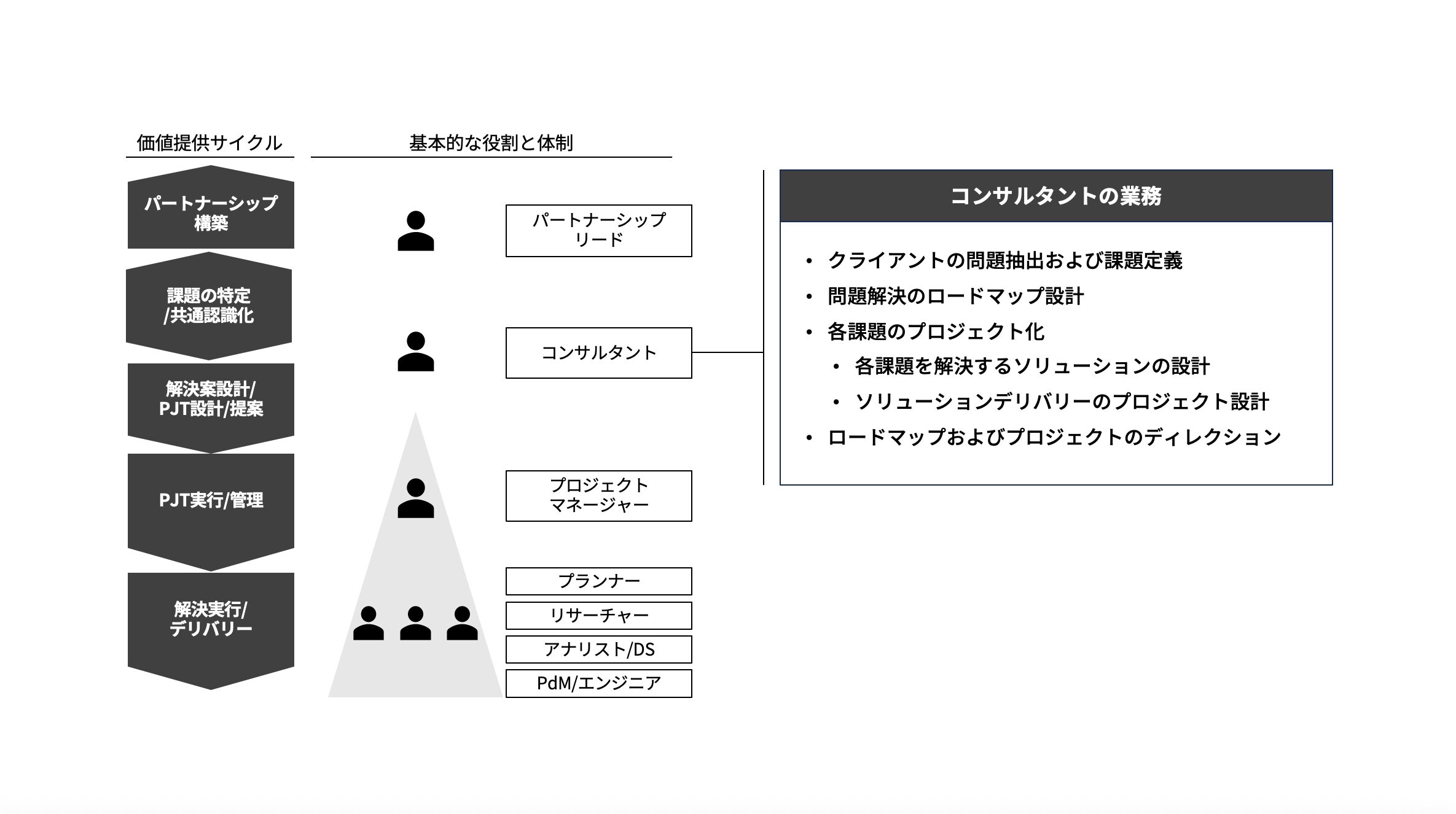 案件ごとに最適なスペシャリストを集め、チームを組成する。その中でコンサルタントが担うのは、家づくりでいえば「建築士」のような役割です。