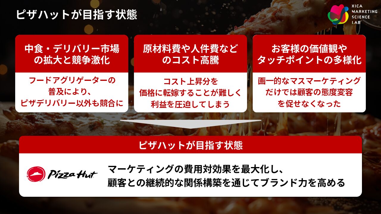 全国に610店舗以上を展開し、成長を続けるピザチェーン「ピザハット」。近年、在宅ワークの定着や共働き世帯の増加を背景に、ピザをはじめとするデリバリー市場は拡大を続けている。しかし、フードアグリゲーター(1つのアプリから複数の飲食店に注文できるサービス)の普及や、コンビニ・スーパーでの低価格ピザの販売により、競争はますます激化。さらに、原材料費や人件費の高騰も業界を直撃しているほか、価値観やタッチポイントの多様化により、従来の画一的なマーケティングに注力するのみでは顧客の態度変容を促すことは困難になっている。