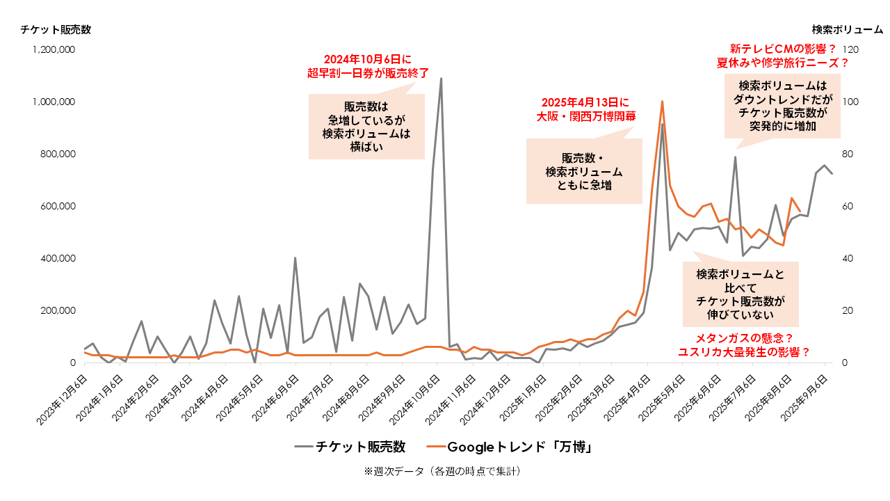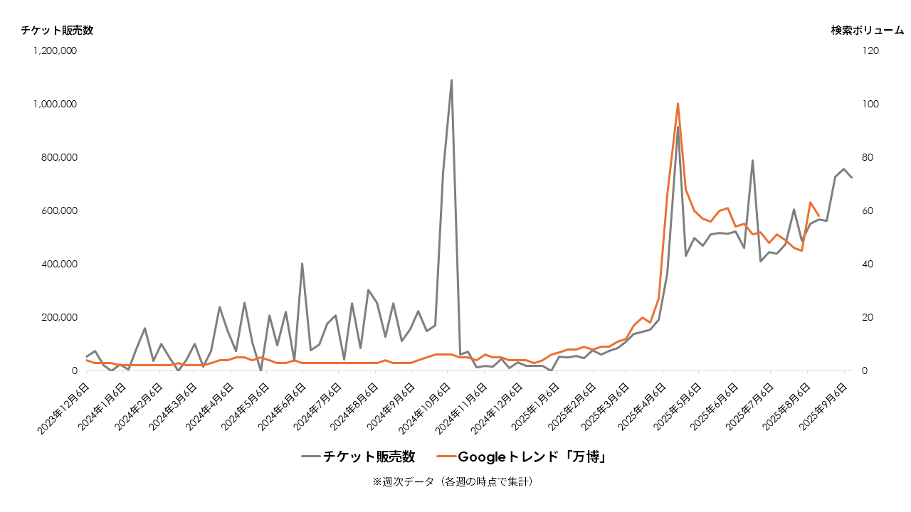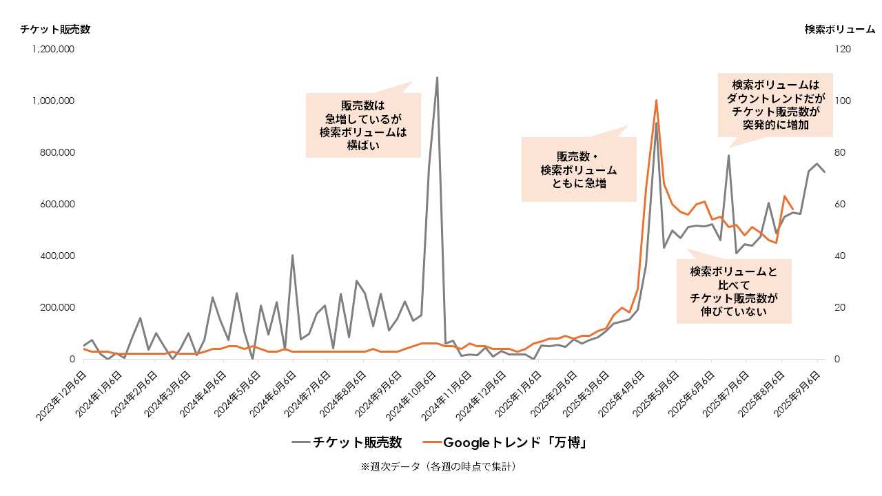 大阪・関西万博の事例でも、チケット販売数とGoogleトレンドの検索ボリュームを時系列で並べてみた結果、次のような気づきが見えてきました。